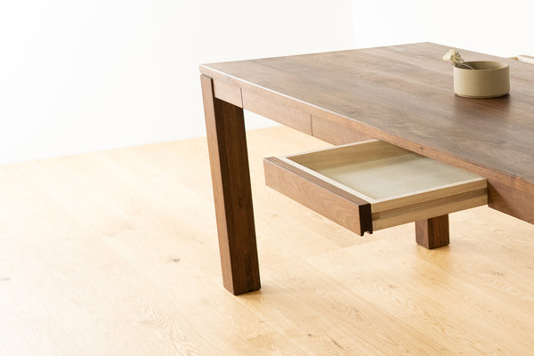 ダイニングテーブルは、引出し仕様に変更をお薦めします。ホームオフィスとして仕事をしたり、お子様の勉強机としても使ったり、ダイニングでの過ごし方が多様化しています。そんなときは、引出しを備え付けていれば、日々の雑多な小物を綺麗に収納でき、必要な時にサッと取り出せて、快適に過ごすことが出来ます。